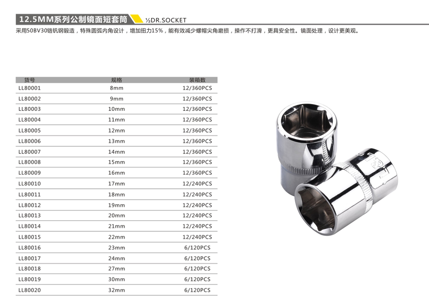 12.5MM系列公制鏡面短套筒